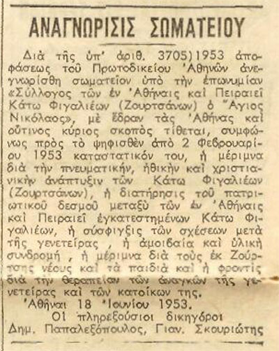 Δημοσίευση της Αναγνώρισης του Συλλόγου στην ΕΣΤΙΑ το 1953