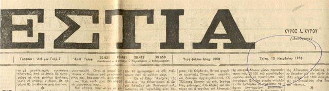 Στις παρακάτω φωτογραφίες εμφανίζονται ο τίτλος της εφημερίδας ΕΣΤΙΑ της 10 Νοεμβρίου του 1953 καθώς και το μονόστηλο με την Αναγνώριση του Συλλόγου που δημοσιεύθηκε σ' αυτή.